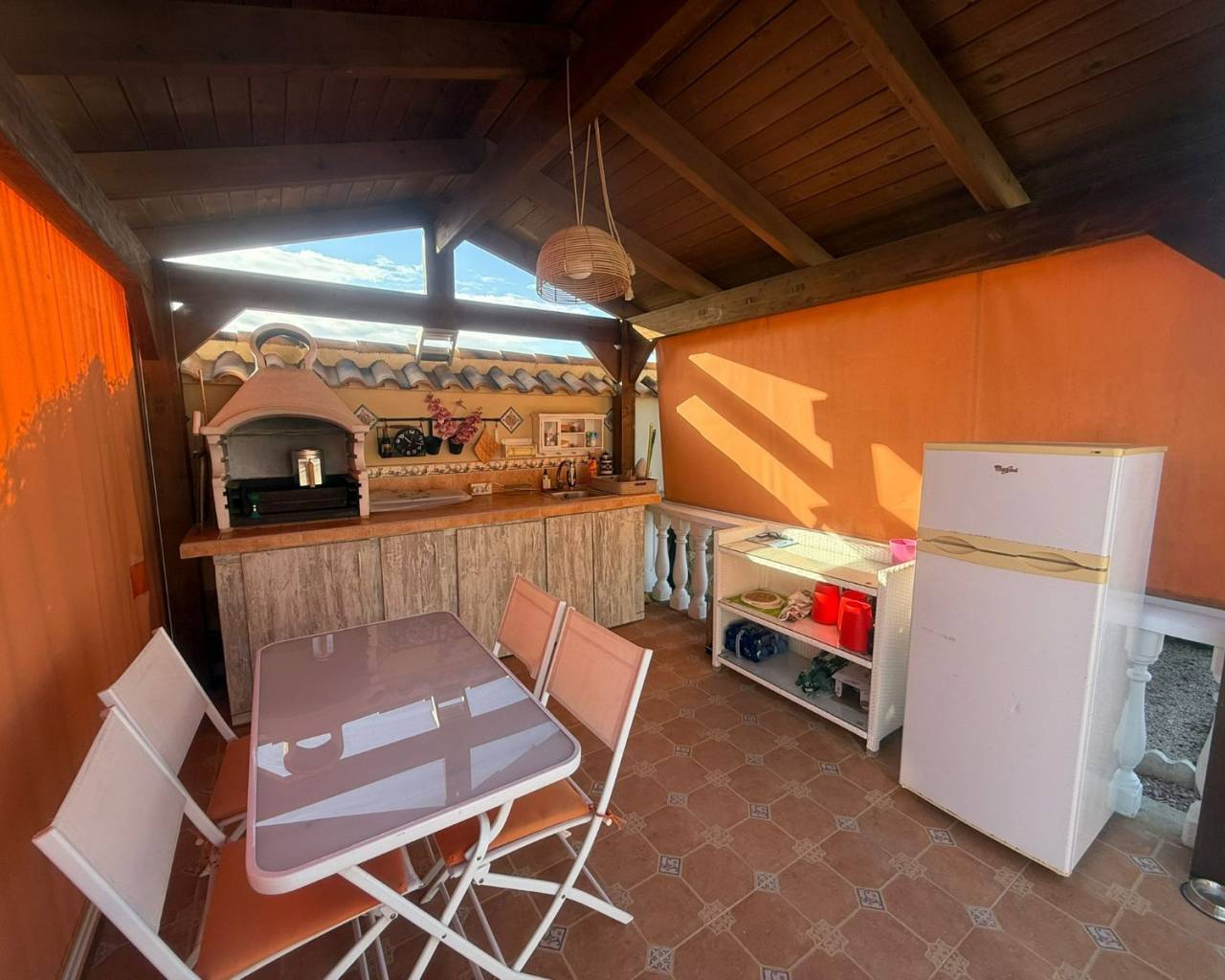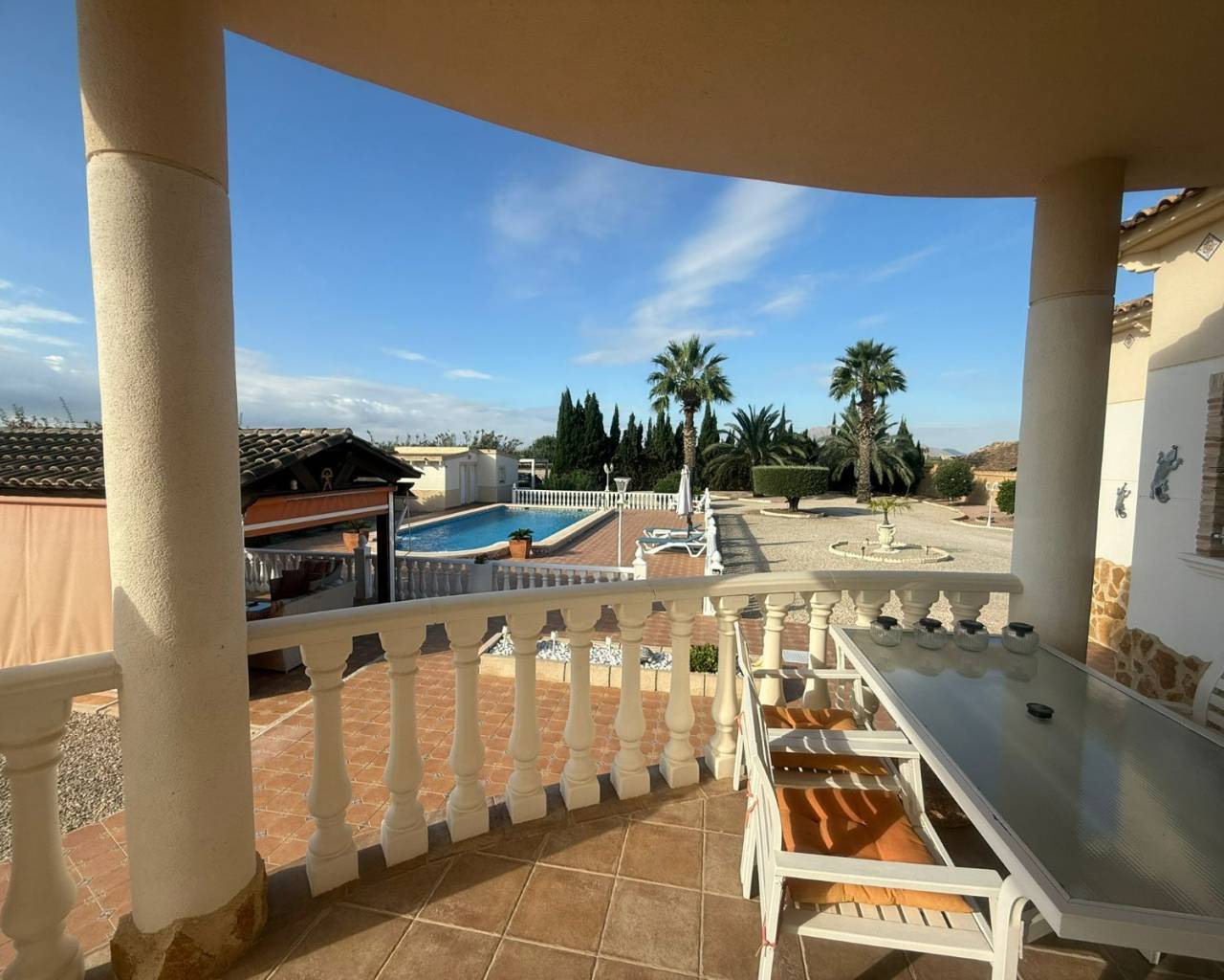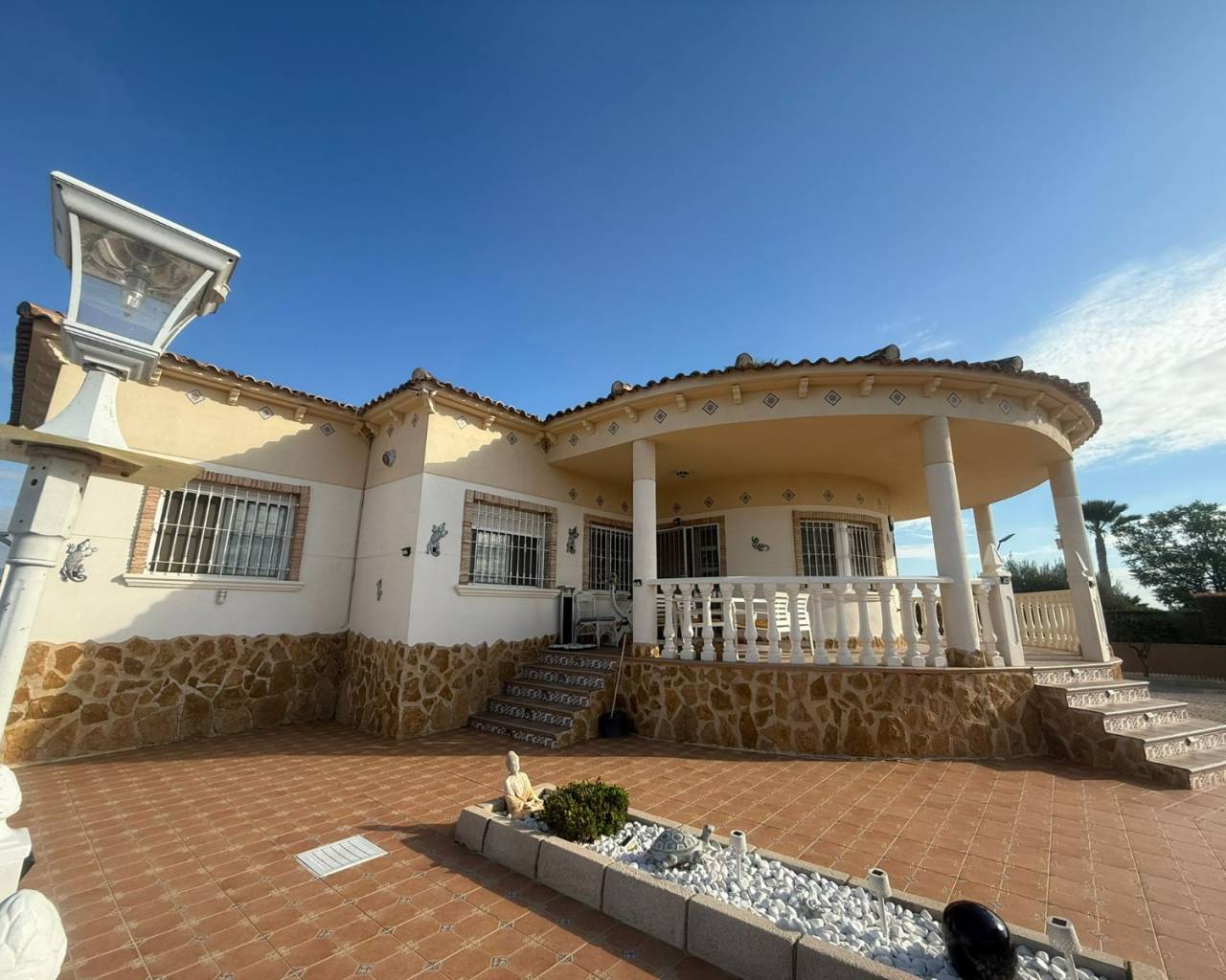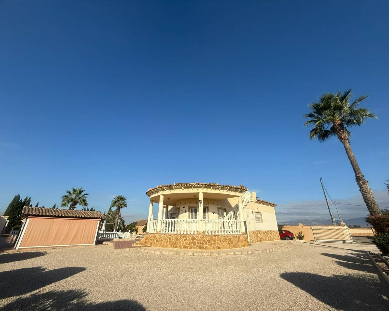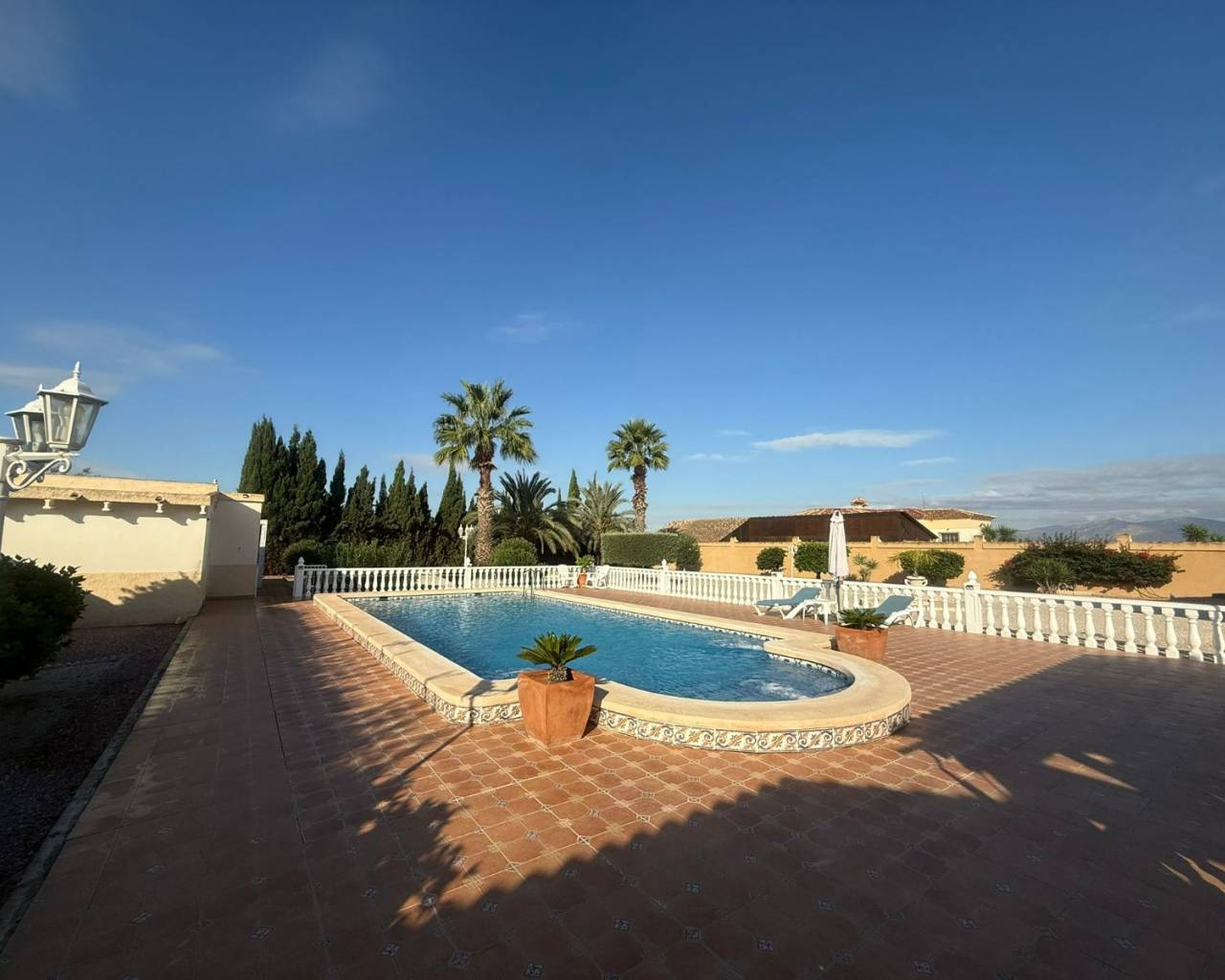 JL Morales Real Estate presenta esta preciosa villa situada en el campo , pero a poca distancia tanto de Dolores como de Catral.Situada en una parcela totalmente vallada con puerta de acceso automática de 2270 m2 , con grava para facilitar el mantenimiento, pero con varias palmeras, arbustos y árboles. Se accede a la vivienda a través de una terraza cubierta con magníficas vistas al campo. Hay un amplio salón comedor (originalmente un dormitorio) y una cocina americana con una puerta trasera que da al jardín, donde también se encuentra un amplio dormitorio con armarios empotrados. A continuación, a través del pequeño vestíbulo, hay un cuarto de baño con bañera a la derecha y un dormitorio con armarios empotrados a la izquierda, que actualmente se utiliza como despacho. Luego está el dormitorio principal, también con armarios empotrados y cuarto de baño en suite con ducha a ras de suelo. La vivienda dispone de aire acondicionado central (frío y calor) regulable por habitaciones, todas las ventanas tienen mosquiteras y rejas de seguridad. En el lateral de la terraza cubierta hay una escalera exterior que conduce a la azotea, con magníficas vistas al campo y a las montañas. Debajo de la escalera hay un lavadero.En la parte trasera del jardín hay una pista de petanca, una cochera, un gran trastero y una caseta de madera/aseo. Y, por supuesto, una piscina de 10 por 5 con terraza, cocina exterior y pérgola de madera, ideal para disfrutar del clima español.A solo unos minutos del centro de Catral y Dolores , a 20 minutos en coche de las hermosas playas de arena de La Marina y Guardamar y a 25 minutos del aeropuerto de Alicante.