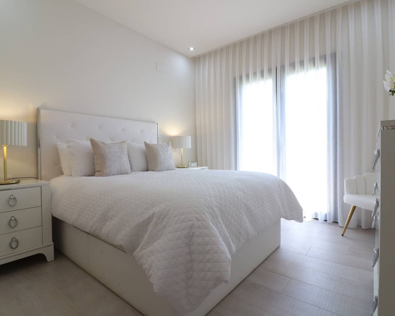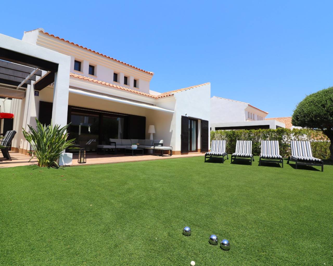 Esta impresionante villa independiente de tres dormitorios con orientación sur, ubicada en el resort de golf La Finca de 5 estrellas, se encuentra a solo un par de minutos en coche de una gran variedad de bares, restaurantes y tiendas, y a solo 5 minutos del encantador pueblo de Algorfa. Los populares pueblos de Almoradí, Quesada y Benijófar están a unos 10 minutos, mientras que las impresionantes playas de la Costa Blanca Sur están a solo 20 minutos en coche. Construida en 2017, esta impresionante villa de 127 m² presume de un hermoso diseño contemporáneo y acabados de alta calidad. El salón, de planta abierta, es luminoso y espacioso, con un techo abovedado con vigas en el salón y grandes puertas correderas acristaladas que inundan el espacio de luz natural. El comedor da paso a una elegante y moderna cocina equipada con barra americana y lavadero independiente. Hay tres dormitorios dobles, todos con armarios empotrados, incluyendo un dormitorio principal con acceso a una terraza privada y baño en suite. Un elegante baño familiar completa el interior. Ubicada en una amplia parcela de 448 m² de fácil mantenimiento, la villa cuenta con una terraza parcialmente cubierta, césped artificial, aparcamiento privado y una cochera. Además, cuenta con aire acondicionado, sistema de riego y acceso a dos hermosas piscinas comunitarias. Una vivienda excepcional en una de las zonas más codiciadas de la Costa Blanca Sur.