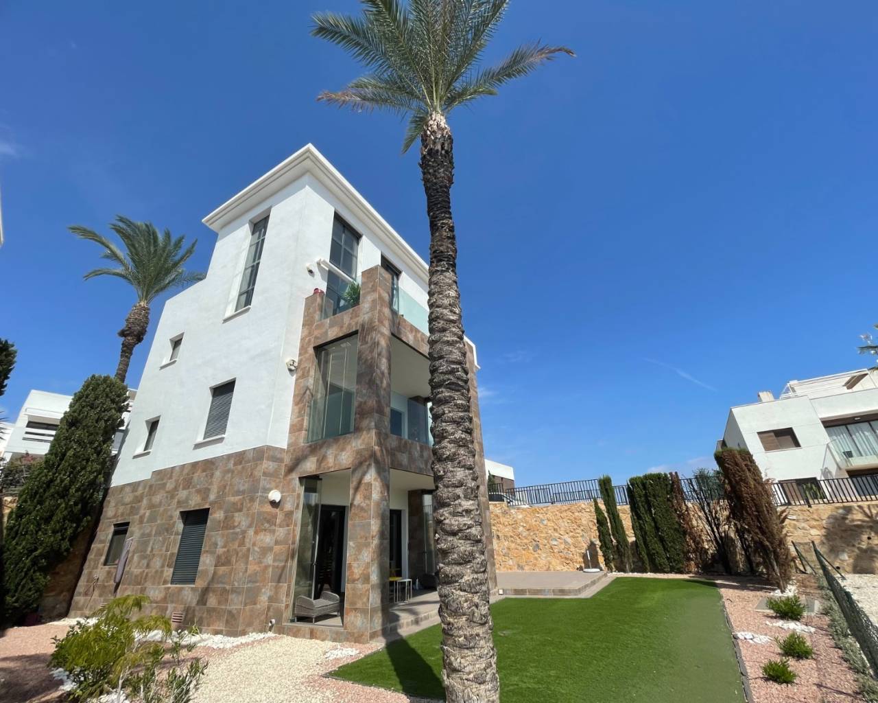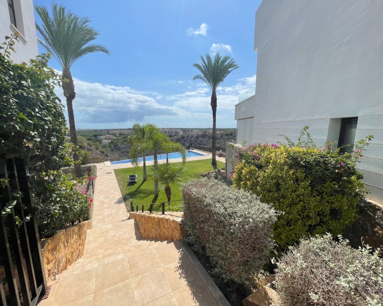 Este ático dúplex de tres dormitorios con orientación sureste en Las Ramblas Golf se encuentra junto a este prestigioso campo de golf, lindando también con Campoamor Golf. A un corto trayecto en coche se encuentran Villamartín, el popular centro comercial La Zenia Boulevard y las hermosas playas de Orihuela Costa, a unos 10 minutos. Esta impresionante casa de diseño arquitectónico moderno ofrece 97 m² distribuidos en dos plantas, con una ubicación elevada y vistas increíbles, pero con acceso cómodo a la sala de estar principal desde la planta baja. El luminoso salón-comedor cuenta con dos puertas correderas acristaladas que dan a la terraza, con una parte de la estancia con techo abovedado y una escalera abierta ultramoderna que permite apreciar plenamente las espectaculares vistas abiertas a través del ventanal de suelo a techo. Una cocina bien equipada con barra americana, dos dormitorios dobles y un baño familiar con ducha completan esta planta. La primera planta alberga el dormitorio principal con baño en suite y acceso directo a una impresionante terraza en forma de L, equipada con toldo retráctil y prácticos armarios de almacenamiento: el lugar perfecto para relajarse y disfrutar de las vistas. Ubicada en una comunidad impecablemente cuidada y bien presentada, los residentes disfrutan de una impresionante piscina comunitaria infinita y aparcamiento privado. Los extras incluyen aire acondicionado. Una propiedad verdaderamente excepcional donde "impresionante" no es suficiente para describir las cualidades y el lujo que ofrece esta casa en la Costa Blanca Sur.