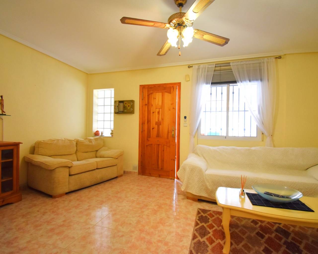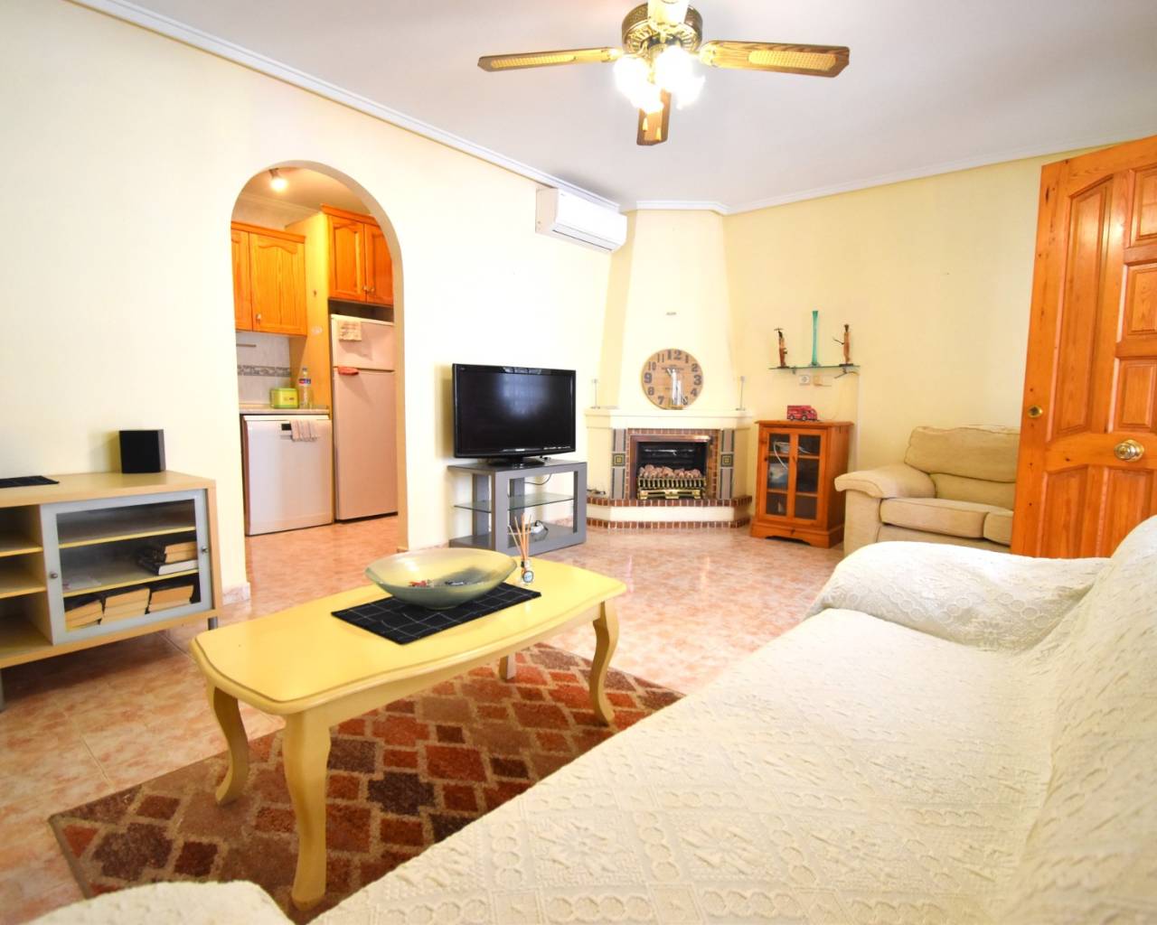 Esta villa cuádruple de dos dormitorios con orientación oeste en Playa Flamenca se encuentra a poca distancia a pie de una amplia variedad de cafeterías, bares, restaurantes y tiendas, a solo un par de minutos a pie. El centro comercial La Zenia Boulevard está a unos 15 minutos a pie o a pocos minutos en coche, mientras que las playas de la costa están a solo 4 minutos en coche y varios campos de golf a entre 5 y 10 minutos. La propiedad se distribuye en una sola planta y consta de una terraza de entrada acristalada, un espacio ideal para relajarse o entretenerse, un cómodo salón-comedor con aire acondicionado, chimenea esquinera y ventilador de techo, además de un arco que da acceso a la cocina equipada y un lavadero. Hay dos dormitorios dobles con armarios empotrados y ventiladores de techo, además de un baño familiar con ducha. Unas escaleras exteriores dan acceso a un fantástico solárium privado de 51 m², ideal para tomar el sol. En el exterior, el jardín de baldosas de fácil mantenimiento ofrece espacio para relajarse, y la casa también cuenta con aparcamiento comunitario cerrado y el uso de una hermosa piscina comunitaria. Una propiedad bien ubicada en el corazón de Orihuela Costa, perfecta como casa de vacaciones o inversión de alquiler en la Costa Blanca Sur