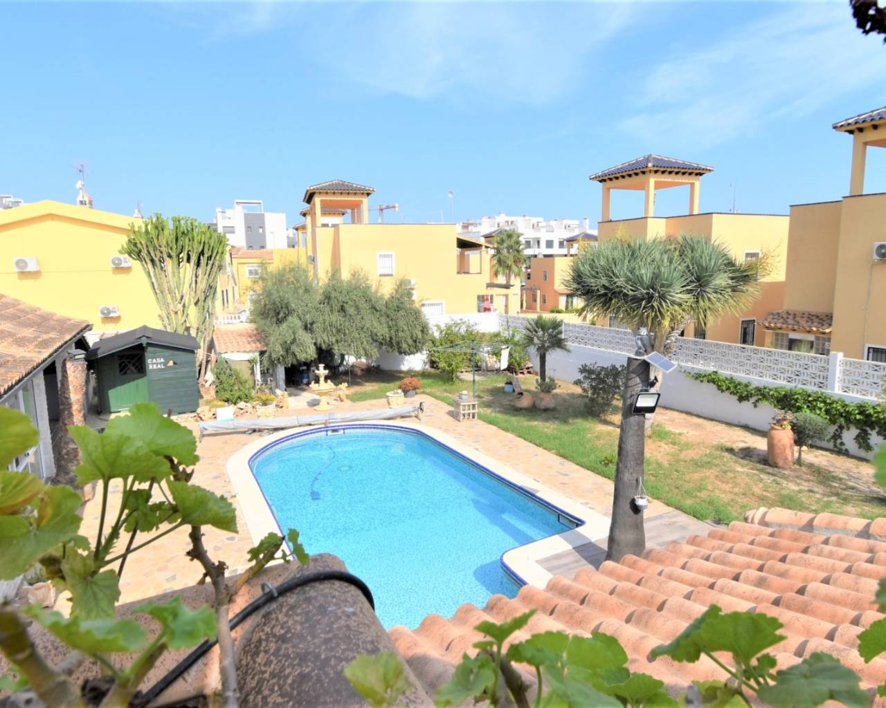 Cette villa individuelle de quatre chambres absolument magnifique, orientée sud, à Villamartin, est située à seulement quelques minutes en voiture du parcours de golf de Villamartin et de sa « place » bien connue. A dix minutes à pied d'un bar/restaurant local et d'un arrêt de bus ; à dix minutes en voiture du centre commercial La Zenia Boulevard et à cinq minutes supplémentaires des plages de la côte. Cette superbe villa de 325 m2 offre un tel caractère, occupant un terrain de 1 762 m2, comprenant : deux ensembles de portes à double ouverture mènent au salon avec cheminée ornée, un large arc carré mène à la salle à manger ; cuisine équipée séparée de style moderne ; buanderie; trois chambres doubles, dont deux avec placards intégrés, la chambre principale avec accès à une terrasse et salle de douche privative, salle de douche familiale. Le premier étage bénéficie d'une chambre double avec placards, accès à une terrasse et salle de douche privative. L'accès interne permet d'accéder jusqu'au solarium. Dehors, il y a une belle terrasse couverte et spacieuse, principalement vitrée et donnant directement sur la piscine privée au sel qui est entourée d'un jardin gazonné et carrelé ; pièce avec réservoirs d'eau pour l'irrigation du jardin, arbustes, buissons, coin cuisine extérieur couvert, nombreuses possibilités de stationnement, y compris un abri de voiture. Les extras comprennent une bodega dans le sous-sol qui a un accès extérieur, des poutres apparentes dans la plupart des pièces et des panneaux solaires pour l'eau chaude.