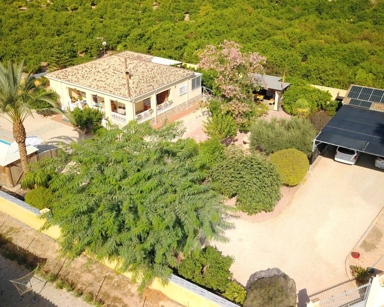 Cette villa de campagne indépendante de trois chambres, exposée plein sud, est située à La Campaneta, au cœur de magnifiques vergers d'agrumes, avec un magnifique paysage de montagnes en toile de fond. Le charmant village de La Campaneta et San Bartolomé, ainsi que les commerces et l'hôpital, sont à seulement 5 minutes en voiture. La ville historique d'Orihuela est accessible en 10 minutes, le complexe hôtelier 5 étoiles La Finca Golf & Spa Resort en 20 minutes, et la côte et ses plages en seulement 25 minutes. Cette villa de 109 m², de plain-pied, dispose d'une charmante terrasse couverte en L de 29 m² donnant sur la piscine privée. À l'intérieur, le salon est climatisé et dispose d'une agréable cheminée d'angle avec poêle à bois ; la cuisine séparée équipée donne accès à la buanderie. La villa comprend trois chambres doubles avec placards intégrés, la chambre principale bénéficiant d'un ventilateur de plafond et d'une salle d'eau attenante. La deuxième chambre bénéficie d'un accès direct à la terrasse et au jardin par des portes-fenêtres coulissantes à double vitrage, ainsi que d'une salle d'eau familiale. Le généreux terrain de 2 322 m², agrémenté de galets et d'arbustes, offre un grand parking hors voirie, un abri voiture et un garage double à deux portes, actuellement utilisé comme atelier. L'espace extérieur est idéal : un espace barbecue, une piscine privée chauffée au sel avec couverture rétractable et plage carrelée, une cuisine couverte en bois, un bar, une salle à manger et un espace détente. La propriété bénéficie également d'un système d'irrigation et de panneaux solaires pour l'eau chaude. Une opportunité exceptionnelle pour ceux qui recherchent la tranquillité d'une vie à la campagne avec le confort moderne sur la Costa Blanca Sud.