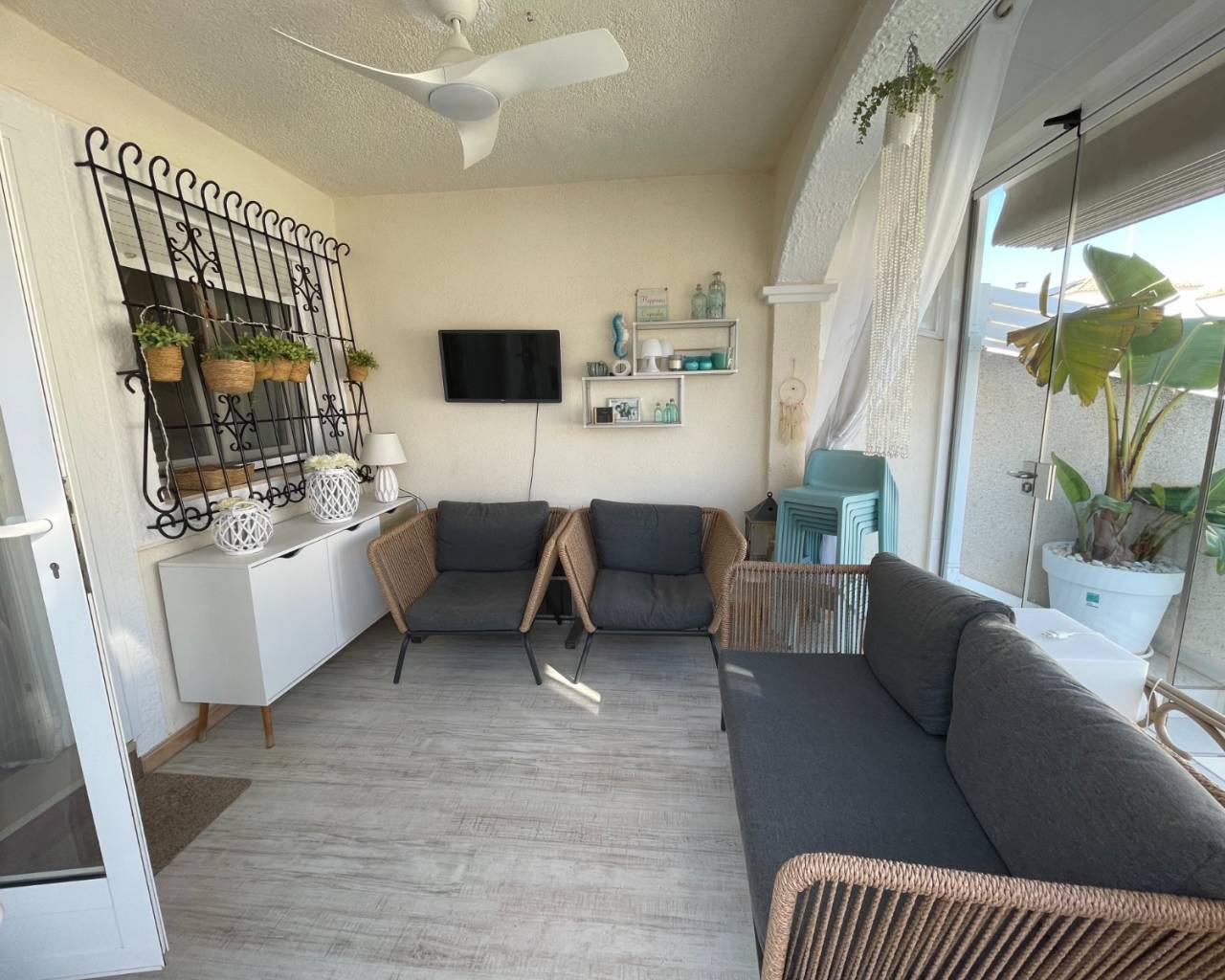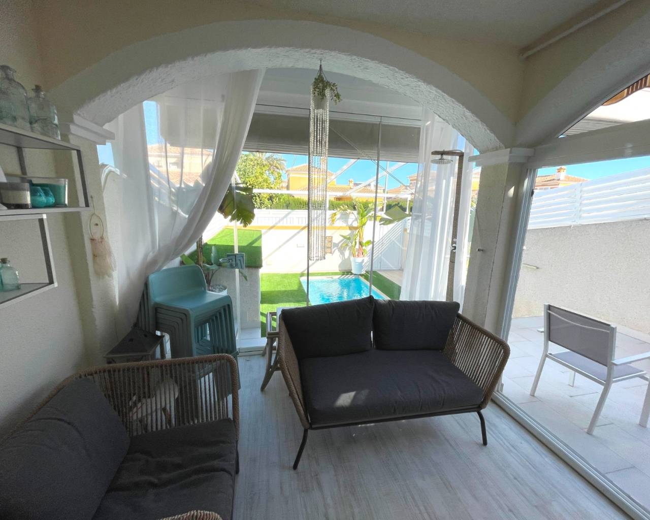 Cette maison de ville rénovée de trois chambres, située à Torre de la Horadada, se trouve à seulement 15 minutes à pied d'une plage idyllique, dans un cadre espagnol traditionnel, à proximité de la place animée, du port de plaisance, des bars, du supermarché et des restaurants. Le Pilar de la Horadada est tout proche, et le golf de Lo Romero ainsi que la Costa Orihuela, avec son célèbre centre commercial La Zenia Boulevard, sont à seulement 10 minutes en voiture. Rénovée avec un souci du détail impeccable par un décorateur d'intérieur en 2023, cette maison de 85 m² aux finitions soignées est répartie sur deux niveaux. La propriété bénéficie d'une spacieuse terrasse d'entrée, fermée par des rideaux de verre et donnant sur la piscine, offrant un espace idéal pour se détendre ou dîner en toute saison. À l'intérieur, le salon est équipé d'un poêle à bois avec un élégant habillage, d'un mur décoratif, d'un ventilateur de plafond et d'un coin repas. Une belle cuisine aménagée séparée donne accès au jardin carrelé à l'arrière. Au rez-de-chaussée se trouvent également une chambre double avec ventilateur de plafond et une salle de douche familiale moderne. Le premier étage comprend deux autres chambres doubles donnant sur une terrasse fermée actuellement aménagée en salon, ainsi qu'une salle de douche familiale contemporaine. Un solarium privé offre un espace extérieur supplémentaire pour profiter du soleil. Le jardin de devant abrite une piscine privée entourée de gazon synthétique, ainsi que de nombreux rangements. Parmi les autres atouts, on trouve la climatisation, des radiateurs électriques et un sèche-serviettes. Une propriété absolument magnifique, présentée avec un goût exceptionnel, située dans l'un des quartiers côtiers les plus prisés de la Costa Blanca Sud.