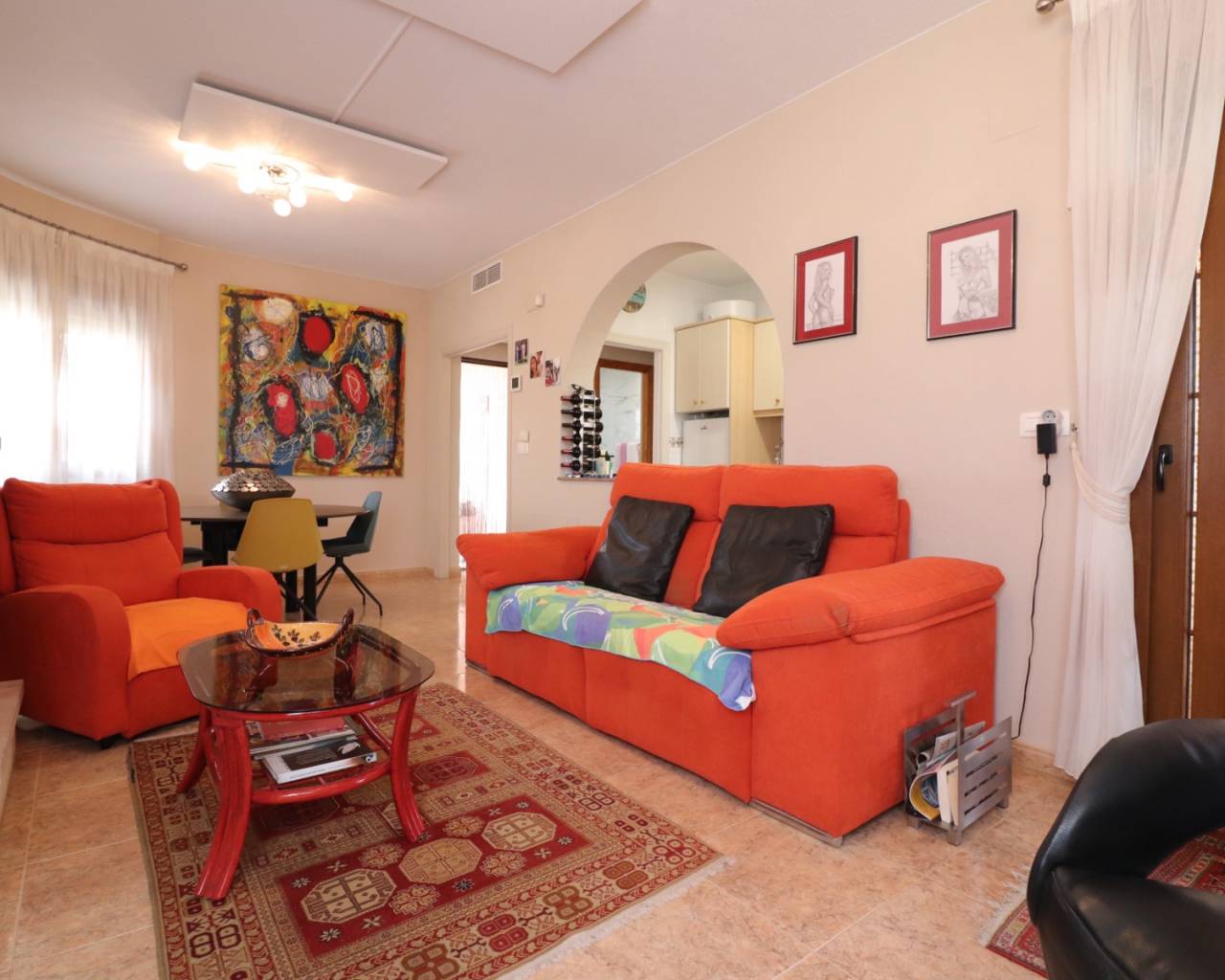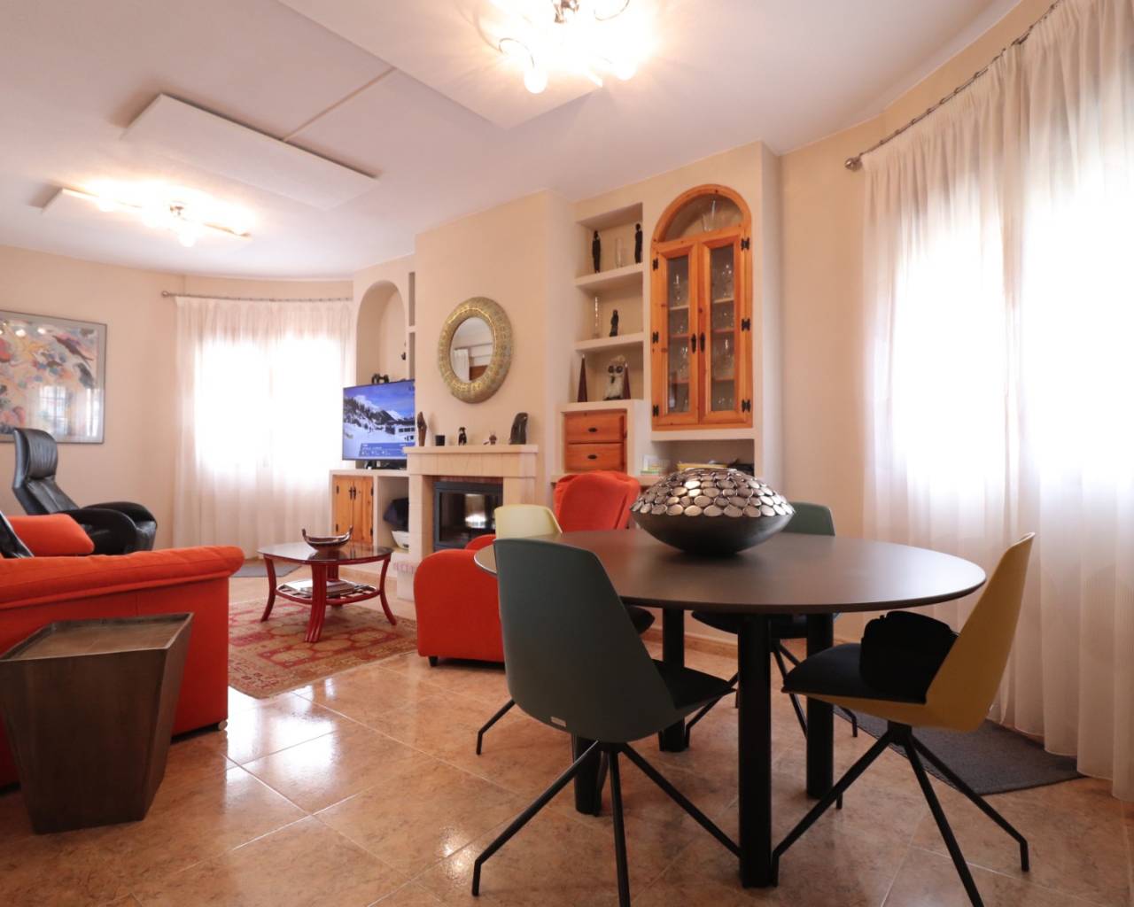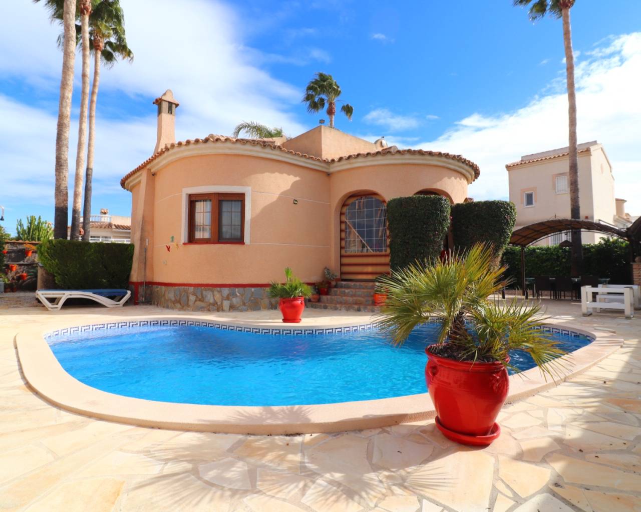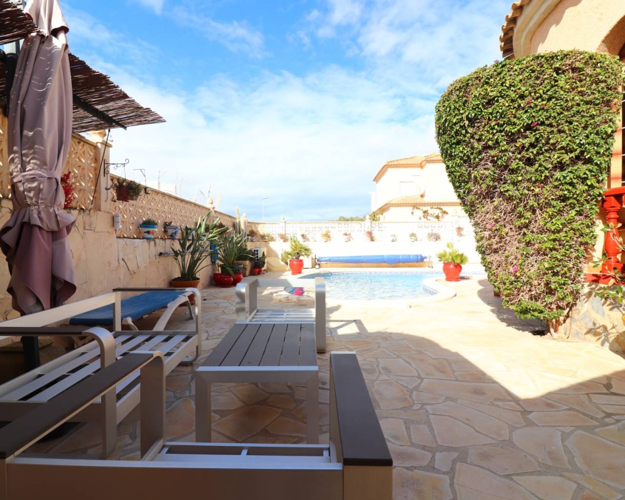 Cette villa individuelle de trois chambres, orientée ouest, est située dans le quartier résidentiel calme d'Atalaya Park à Benijofar. Un supermarché d'une grande chaîne se trouve à seulement 5 minutes à pied. Le centre-ville de Benijofar est à quelques minutes en voiture, tandis que la rue commerçante de Quesada est accessible en 5 minutes. Les amateurs de golf apprécieront le parcours de La Marquesa, à seulement 10 minutes en voiture, et la magnifique côte sud de la Costa Blanca est également facilement accessible. Cette maison de plain-pied de 111 m², bien agencée, occupe un généreux terrain d'angle de 445 m², entièrement clos de murs. Le salon/salle à manger, lumineux et accueillant, est agrémenté d'une cheminée de caractère avec poêle à bois et panneau chauffant infrarouge. Des portes coulissantes vitrées donnent sur une terrasse couverte, fermée par des stores enrouleurs et actuellement utilisée par les propriétaires comme espace repas supplémentaire. La cuisine américaine équipée est complétée par une buanderie séparée. Cette villa offre trois chambres doubles, toutes dotées de placards intégrés, et deux salles de douche modernes avec douches à l'italienne, dont une attenante à la suite parentale. À l'extérieur, vous accédez à un solarium privé recouvert de gazon synthétique, d'où vous pourrez admirer la montagne et le coucher du soleil. Le jardin arboré comprend des zones de galets et de carrelage, une piscine privée en forme de haricot et un vaste espace pour se détendre ou recevoir. Une salle à manger couverte jouxte une superbe cuisine d'été, et un barbecue est à votre disposition pour profiter du plein air toute l'année. Un local de rangement, accessible par la route, est idéal pour garer une moto en toute sécurité. Cette magnifique villa individuelle offre espace, intimité et d'excellents espaces de vie extérieurs, ce qui en fait une résidence principale ou secondaire idéale au cœur de la Costa Blanca Sud.