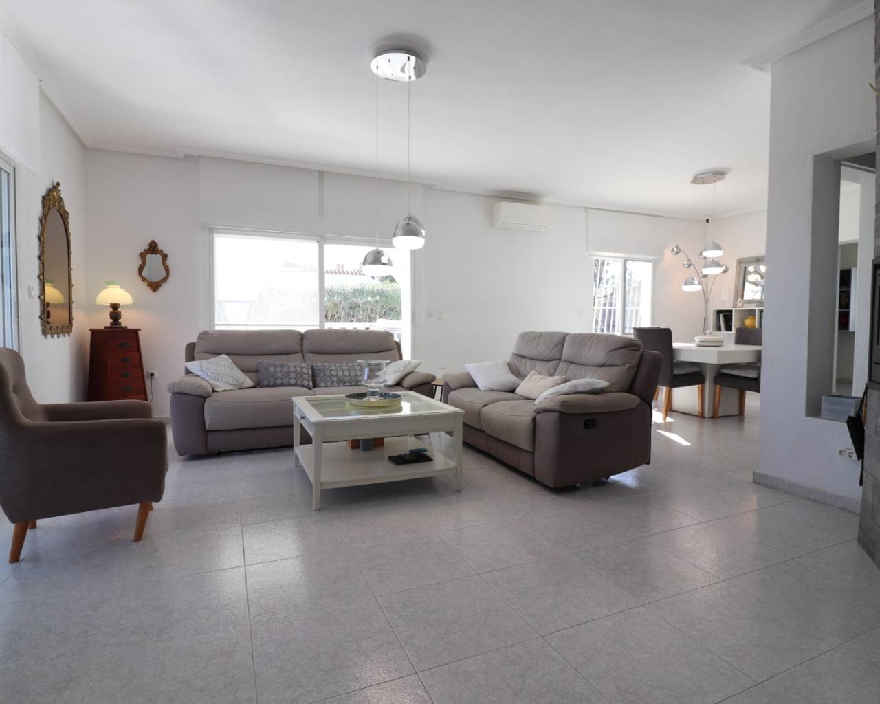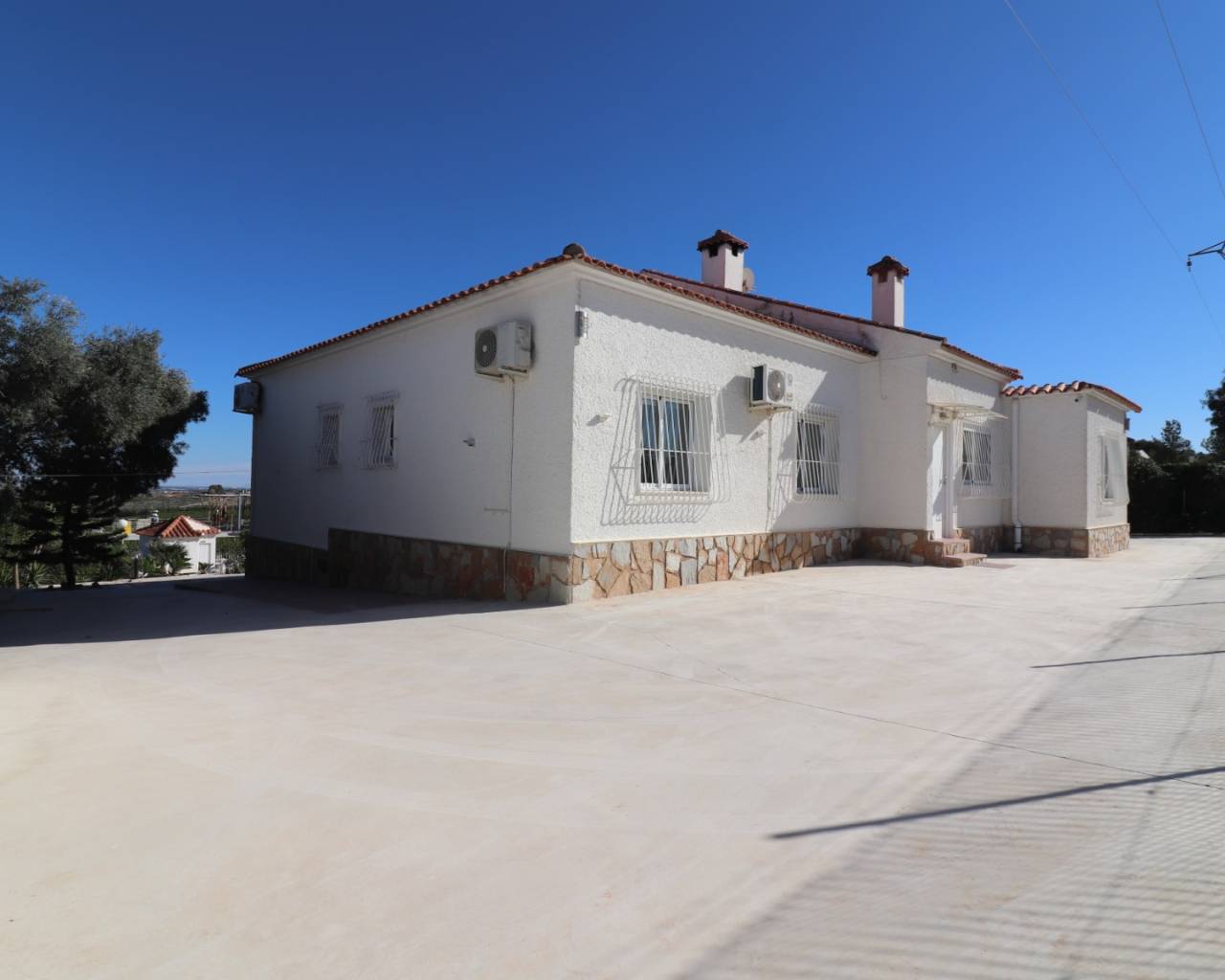 Deze ruime vrijstaande villa met vier slaapkamers in Lomas de la Juliana is gelegen op een prominente locatie vlakbij het 5* Hotel, Spa en Golf Resort La Finca, met bars en restaurants in de buurt, en het dorp Algorfa op slechts een paar minuten rijden. De steden Almoradí en Benijofar, met belangrijke voorzieningen, liggen op 5 tot 10 minuten rijden, terwijl de prachtige stranden van de Costa Blanca Zuid in 15 tot 20 minuten te bereiken zijn. Gelegen op een indrukwekkend perceel van 1.355 m², is deze gelijkvloerse villa van 215 m² prachtig gepresenteerd en biedt een royale open, mooie leefruimte. De hal leidt via een vierkante boog naar de woonkamer, met een opvallende muur met een ingebouwde houtkachel en twee dubbele schuifdeuren met elektrische jaloezieën die uitkomen op een overdekt terras. Er is een eethoek, een aparte, volledig ingerichte keuken met deur naar de achtertuin en een bijkeuken. De villa beschikt over vier tweepersoonsslaapkamers, allemaal met inbouwkasten, waaronder een hoofdslaapkamer met een eigen badkamer met douche, plus een familiebadkamer. Vanuit het beste deel van de woning kunt u genieten van een weids uitzicht over het omliggende landschap. Het aangelegde perceel beschikt over een buitendouche, een privézwembad van 12 x 6 meter (wel wat onderhoud nodig), voldoende parkeergelegenheid op eigen terrein, een carport en een garage voor twee auto's. Extra voorzieningen zijn onder andere airconditioning in drie kamers, een irrigatiesysteem, een buitenkeuken en een berging. Deze uitzonderlijke villa biedt een ruime, comfortabele woonomgeving met uitstekende buitenruimtes, ideaal om te genieten van de mediterrane levensstijl in de gewilde wijk Lomas de la Juliana aan de Costa Blanca Zuid.