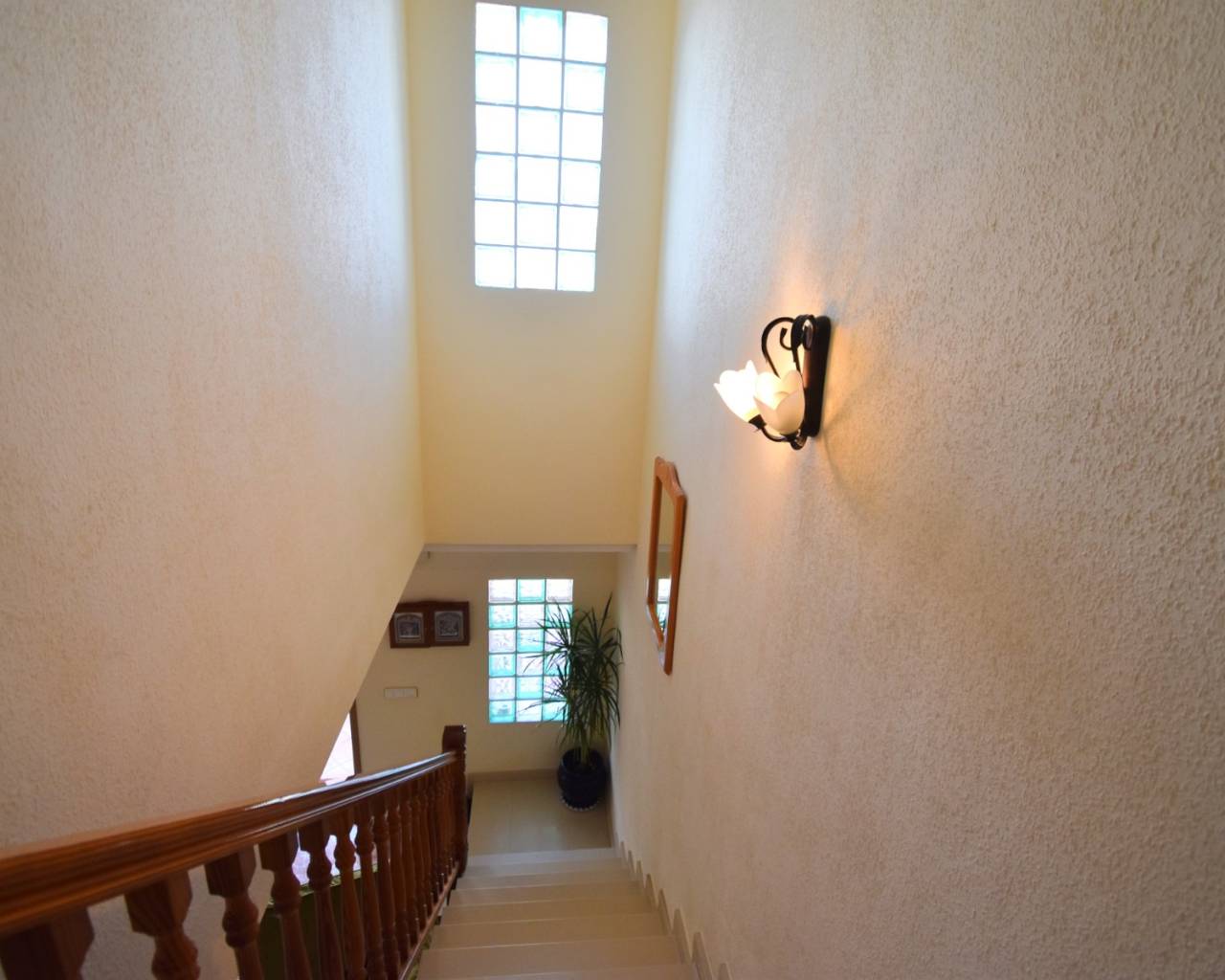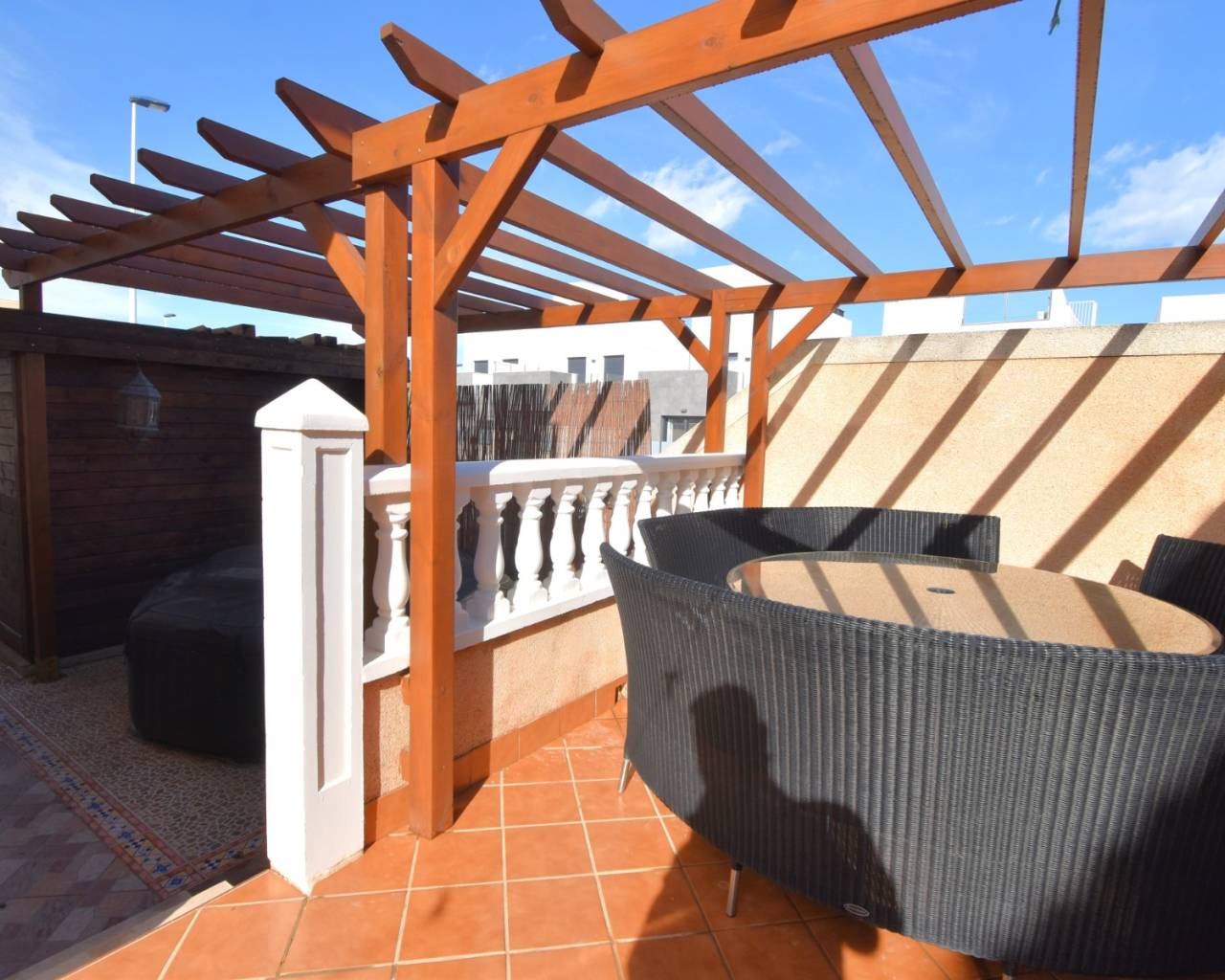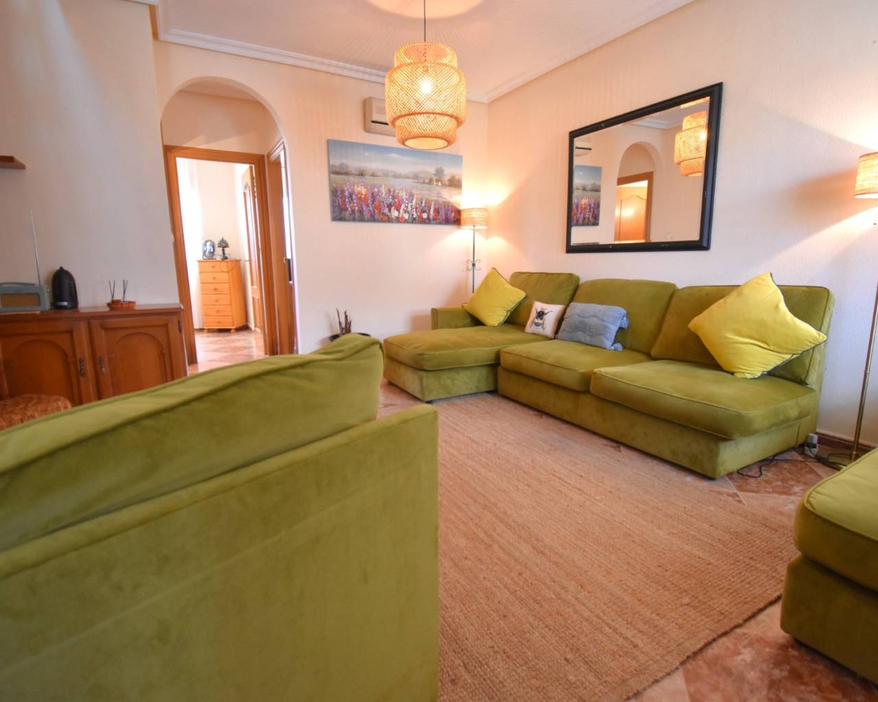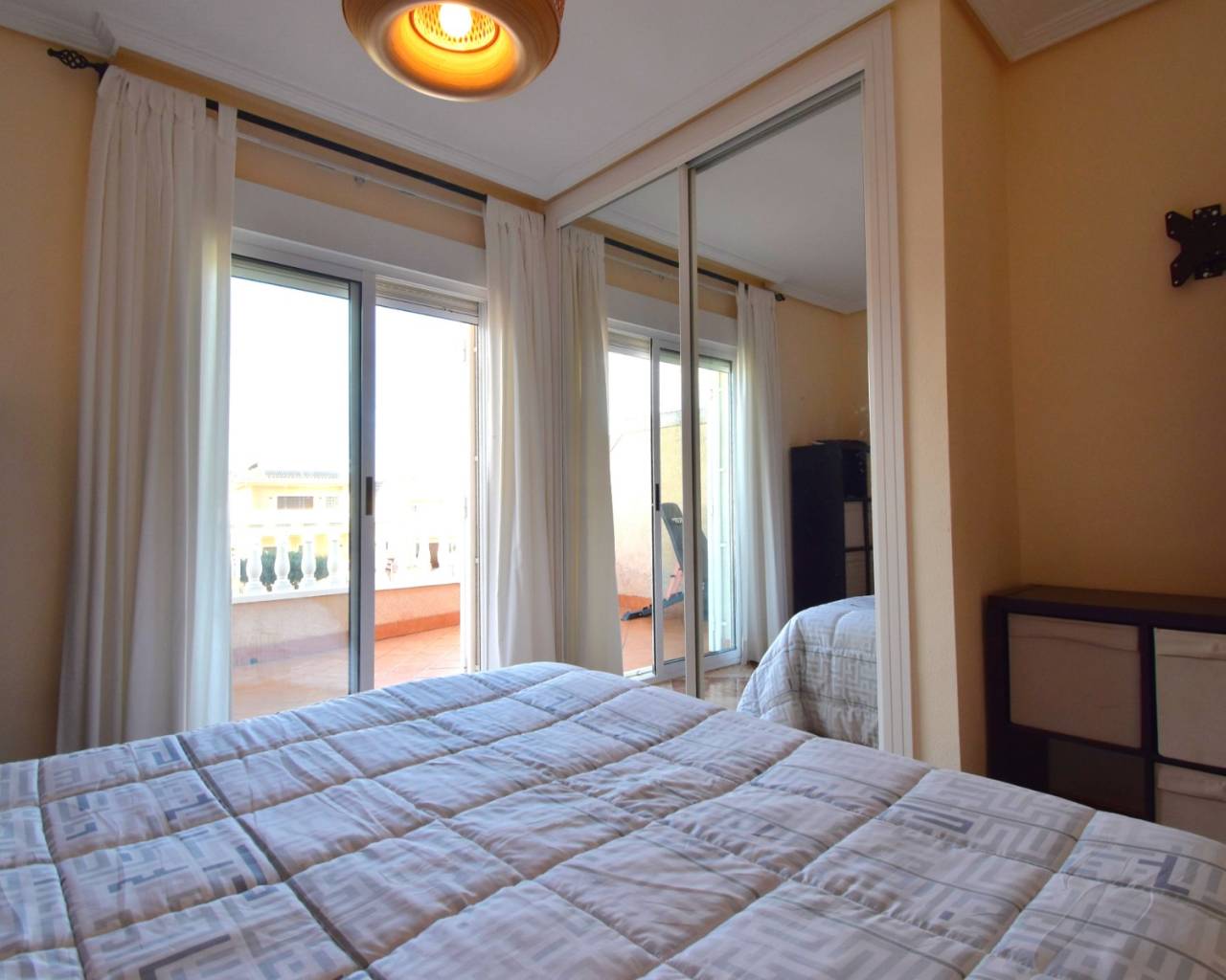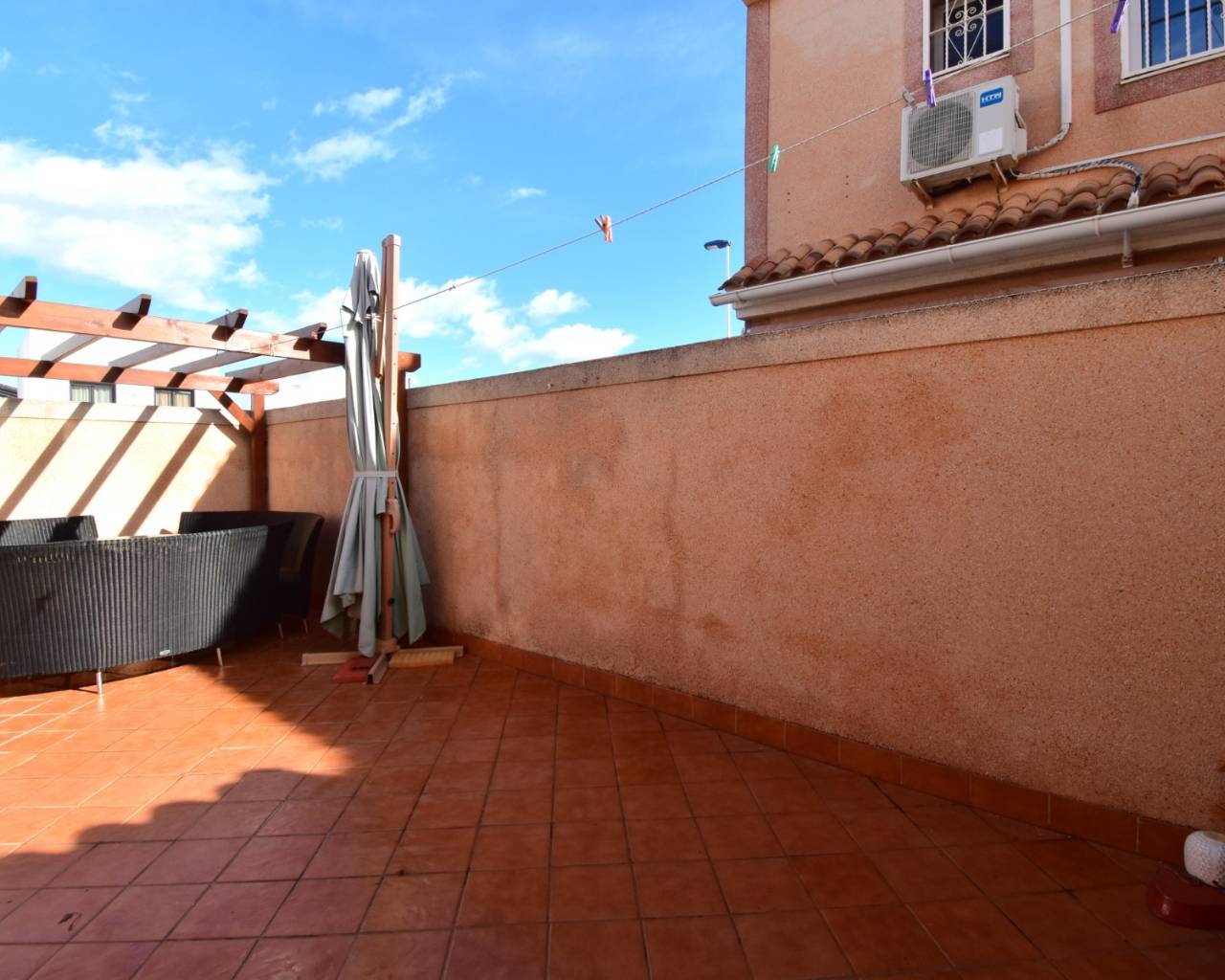Deze op het westen georiënteerde hoekwoning met drie slaapkamers in Los Balcones ligt vlakbij het winkelcentrum van Filton, met diverse cafés en restaurants op 10-15 minuten loopafstand. Een grote supermarktketen en het ziekenhuis van Torrevieja liggen op slechts een paar minuten rijden, terwijl de voorzieningen van de Orihuela Costa, waaronder winkelcentrum La Zenia Boulevard, prachtige stranden en diverse golfbanen, binnen 10 minuten te bereiken zijn. Dit maakt het een uitstekend gelegen woning aan de Costa Blanca Zuid. Deze goed onderhouden woning staat op een indrukwekkend hoekperceel van 153 m² en biedt een woonoppervlakte van 91 m². Een overdekt terras leidt naar de woonkamer, die is voorzien van airconditioning en een trap naar de eerste verdieping. Op de begane grond bevindt zich verder een aparte ingerichte keuken met een deur naar de achterzijde van de woning, een toilet, een tweepersoonsslaapkamer en een doucheruimte. Op de eerste verdieping bevinden zich nog twee tweepersoonsslaapkamers, waarvan de hoofdslaapkamer toegang heeft tot een privéterras. Een gezinsbadkamer completeert deze verdieping, voorzien van een hoekjacuzzi voor extra comfort. Ingebouwde kledingkasten bieden uitstekende opbergruimte in de hele woning. De buitenruimte is een waar hoogtepunt, met een volledig betegelde tuin met parkeergelegenheid, een kiezelgedeelte met aangeplante struiken en bomen, en extra betegelde ruimte aan de achterzijde. Verder zijn er een berging en een houten schuur. Bewoners hebben ook toegang tot een prachtig gemeenschappelijk zwembad met betegelde en met gras omranding, evenals gemeenschappelijke parkeergelegenheid. Deze ruime hoekwoning is ideaal als gezinswoning, vakantiehuis of investering, en biedt een royale buitenruimte en een toplocatie aan de Costa Blanca Zuid.