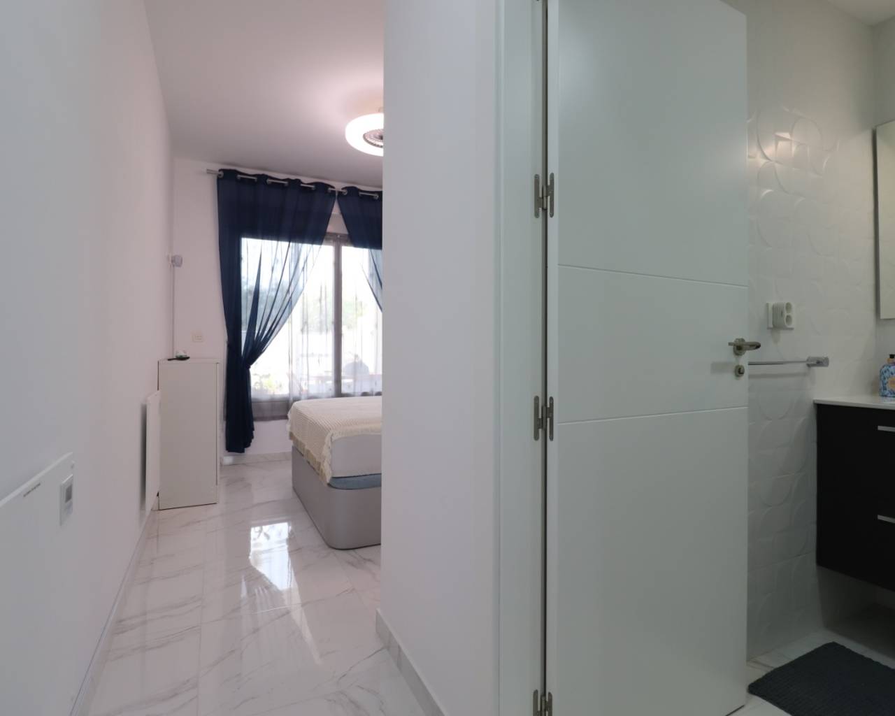 Dit appartement met drie slaapkamers op de begane grond in Benijofar, gelegen op het oosten, bevindt zich op slechts 5 minuten lopen van de dichtstbijzijnde winkels, bars, restaurants en bakkerij, en op slechts 2 minuten rijden van een grote supermarkt. De prachtige stranden van de Costa Blanca Zuid zijn in circa 15 minuten te bereiken. De woning biedt een ruime woonoppervlakte van 100 m² op een perceel van 112 m², met een open keuken die doorloopt naar de woonkamer, voorzien van airconditioning. Vanuit de woonkamer geven schuifdeuren toegang tot een privéterras aan de voorzijde, ideaal om te ontspannen of buiten te dineren. Er zijn drie tweepersoonsslaapkamers met inbouwkasten, waarvan één met een eigen terras en en-suite badkamer. De overige slaapkamers worden bediend door een gezinsbadkamer. Airconditioning is in alle slaapkamers geïnstalleerd voor extra comfort. Het complex beschikt over een gemeenschappelijk zwembad en de woning omvat tevens een parkeerplaats in de kelder en een eigen berging. Een fantastische kans voor een vakantiehuis of permanente bewoning in het hart van de Costa Blanca Zuid.