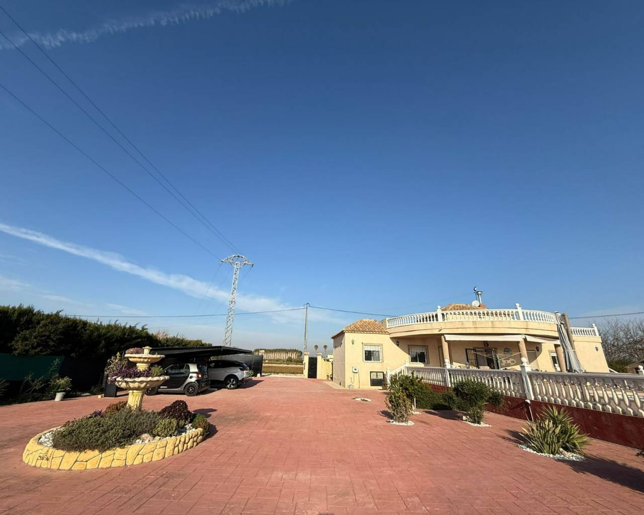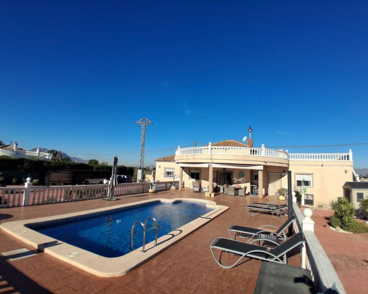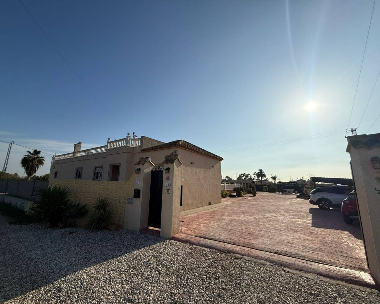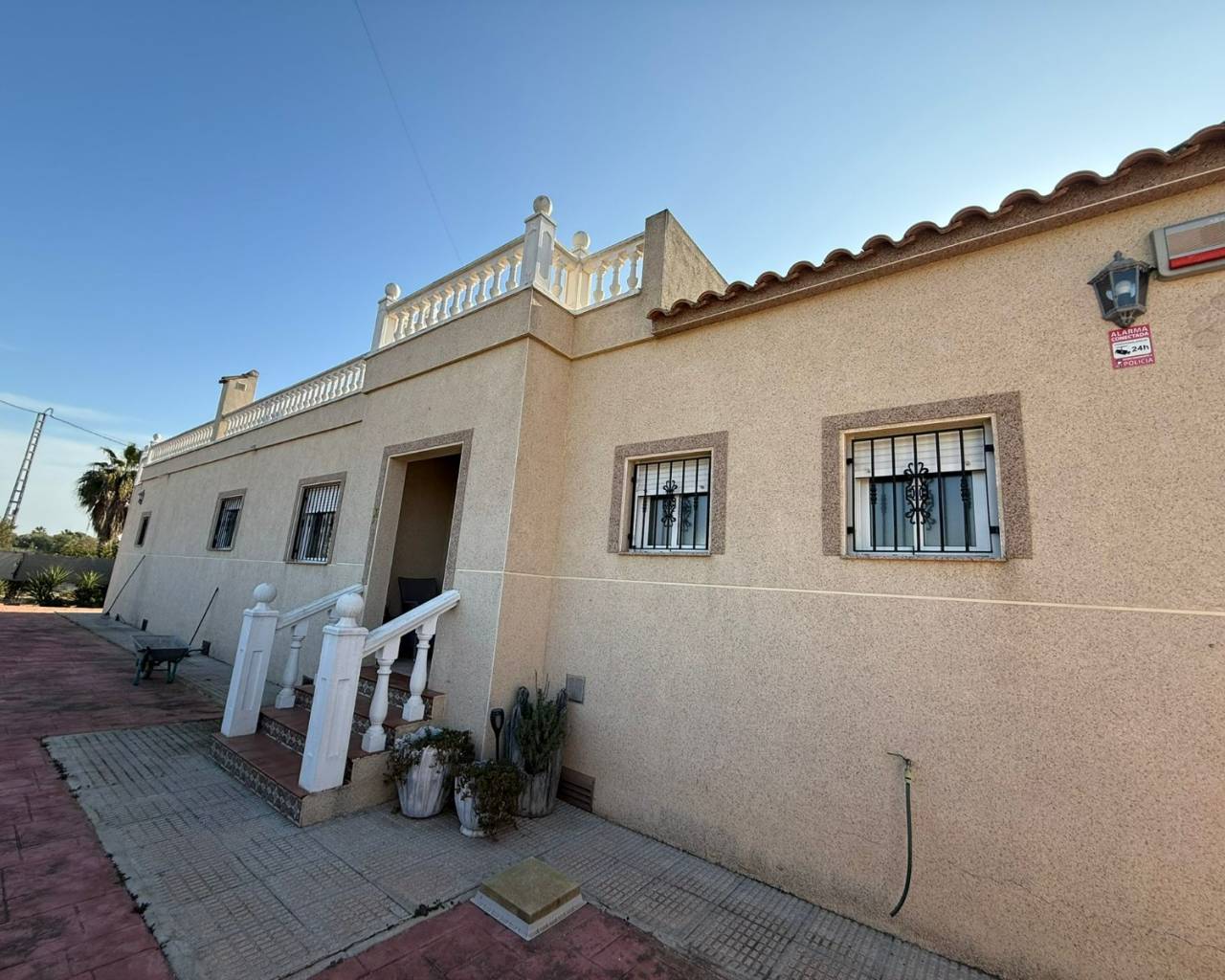 JL Morales Real Estate presents this charming countryside property, set in a peaceful location yet only five minutes from all amenities. It offers an ideal blend of tranquillity, space and comfort. The home is ideally situated just 20 minutes from the beautiful beaches of Guardamar and 30 minutes from Alicante International Airport, making it perfect for both holidays and full-time living.Upon entering, the hallway leads to the left into a spacious and bright living room featuring high ceilings, a pellet stove and a pleasant dining area. Adjacent to this space is the large separate kitchen. The master bedroom includes a dressing room and an ensuite bathroom with a modern walk-in shower. A separate guest toilet completes this side of the home.On the right side of the hallway, you will find two comfortable bedrooms with built-in wardrobes and a second bathroom with space for a washing machine and dryer. The home is sold furnished and comes equipped with mosquito screens and central air conditioning for year-round comfort.From the living room, you step out onto a covered terrace that flows into a sunny terrace with a swimming pool, offering beautiful open views over the surrounding countryside. The fully fenced plot of 1,734 m² is landscaped with various plants and trees and requires minimal maintenance. A double carport, wooden garden shed, pergola seating area and barbecue complete the outdoor amenities. A staircase on the side of the house leads to the rooftop terrace, where the panoramic views are even more striking.