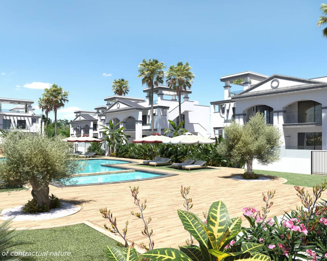 Each flat has 2 bedrooms and 2 bathrooms, as well as a storage room and parking within the development. The development offers communal areas designed for enjoyment and relaxation, with a large communal swimming pool and spacious green areas that create an atmosphere of exclusivity and wellbeing.